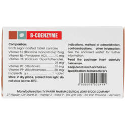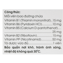 - Thành phần B-coenzyme hoạt chất: Vitamin B1 (Thiamin mononitrat) 15mg, Vitamin B6 (Pyridoxin.HCl ) 10 mg, Vitamin B5 (Calcium D-pantothenat) 25 mg, Vitamin B2 (Riboflavin) 15mg, Vitamin PP (Nicotinamid) 50 mg