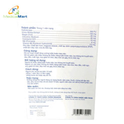 - Phụ liệu: Chất làm trơn: magnesi stearat; chất tạo dính: polyvinylpyrrolidone (PVP); chất làm dày: talc vừa đủ 500mg.