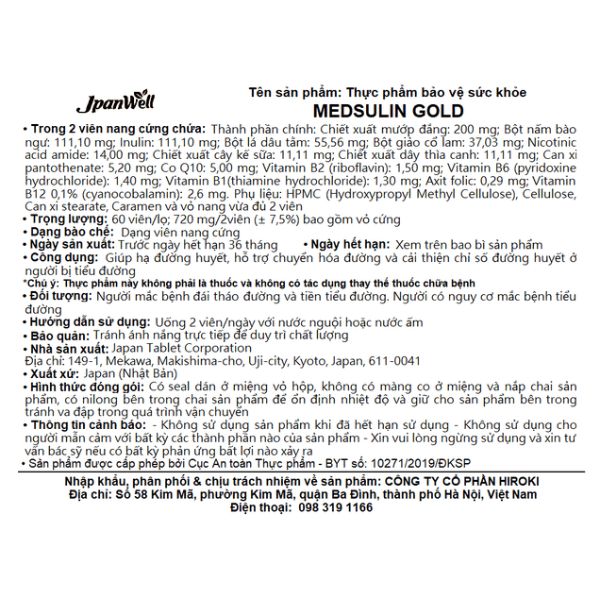 Mô tả viên uống Medsulin Gold Jpanwell giúp hạ đường huyết, hỗ trợ chuyển hóa đường