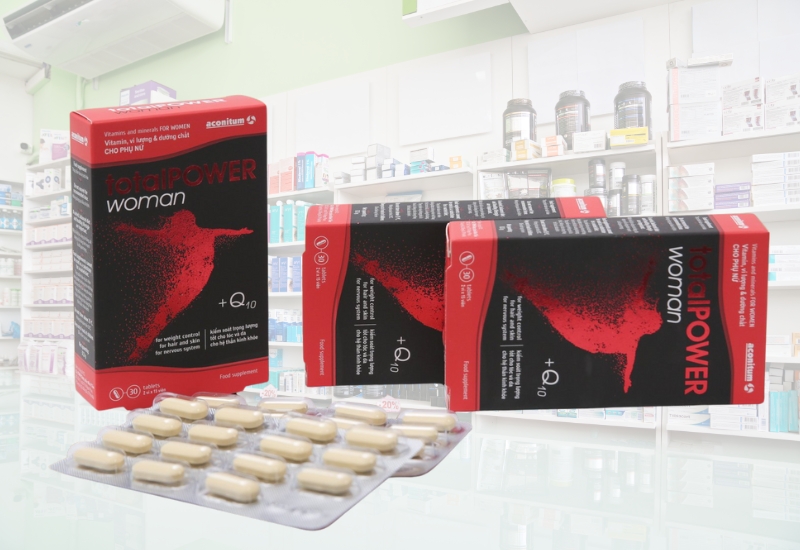 Công dụng: Viên uống Totalpower Woman Aconitum bổ sung 24 loại dưỡng chất khác nhau, cho vóc dáng luôn khỏe đẹp; giảm căng thẳng trước và trong kỳ kinh nguyệt; giúp da, tóc khỏe mạnh; tăng cường chức năng thần kinh; chống lão hóa; duy trì chức năng tuyến giáp; kiểm soát đường huyết; cung cấp năng lượng cho cơ thể