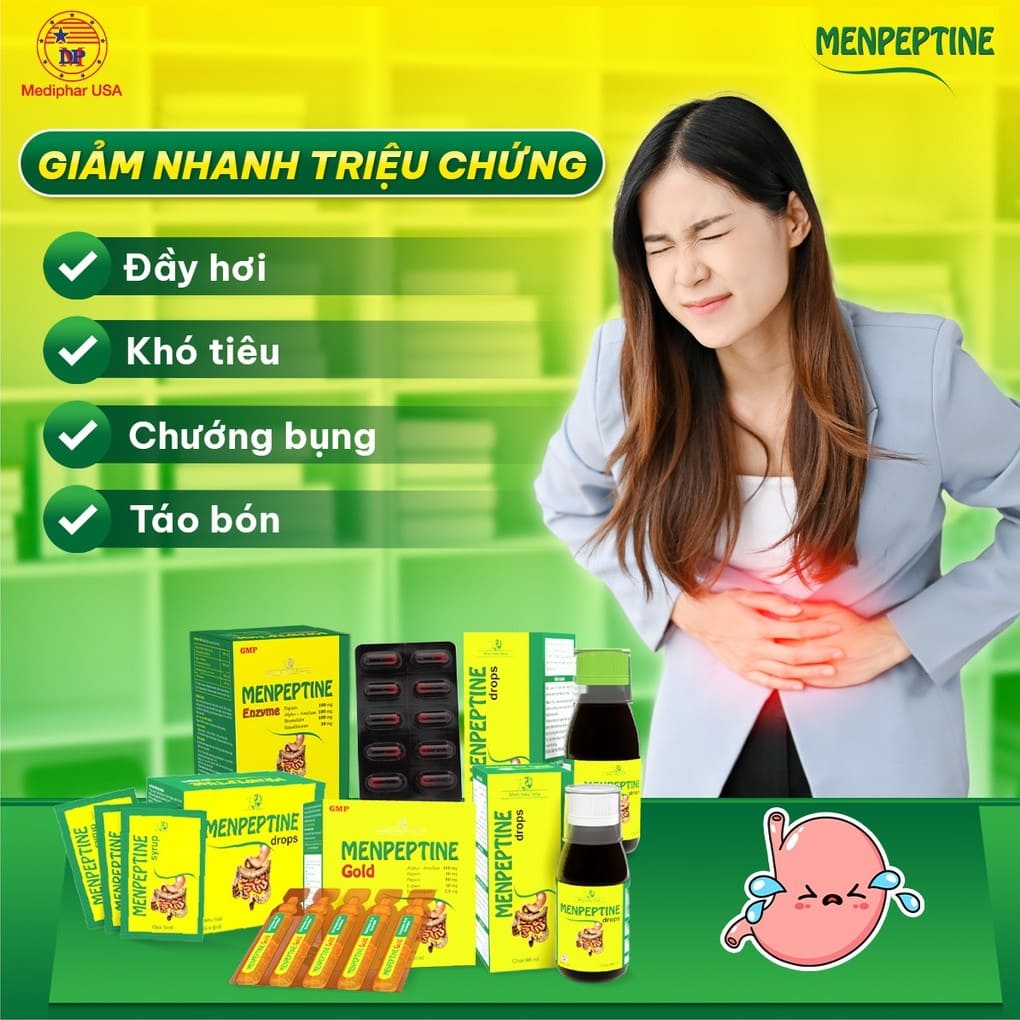 Menpeptine là sản phẩm giúp hỗ trợ tiêu hóa, giảm triệu chứng đầy hơi, khó tiêu