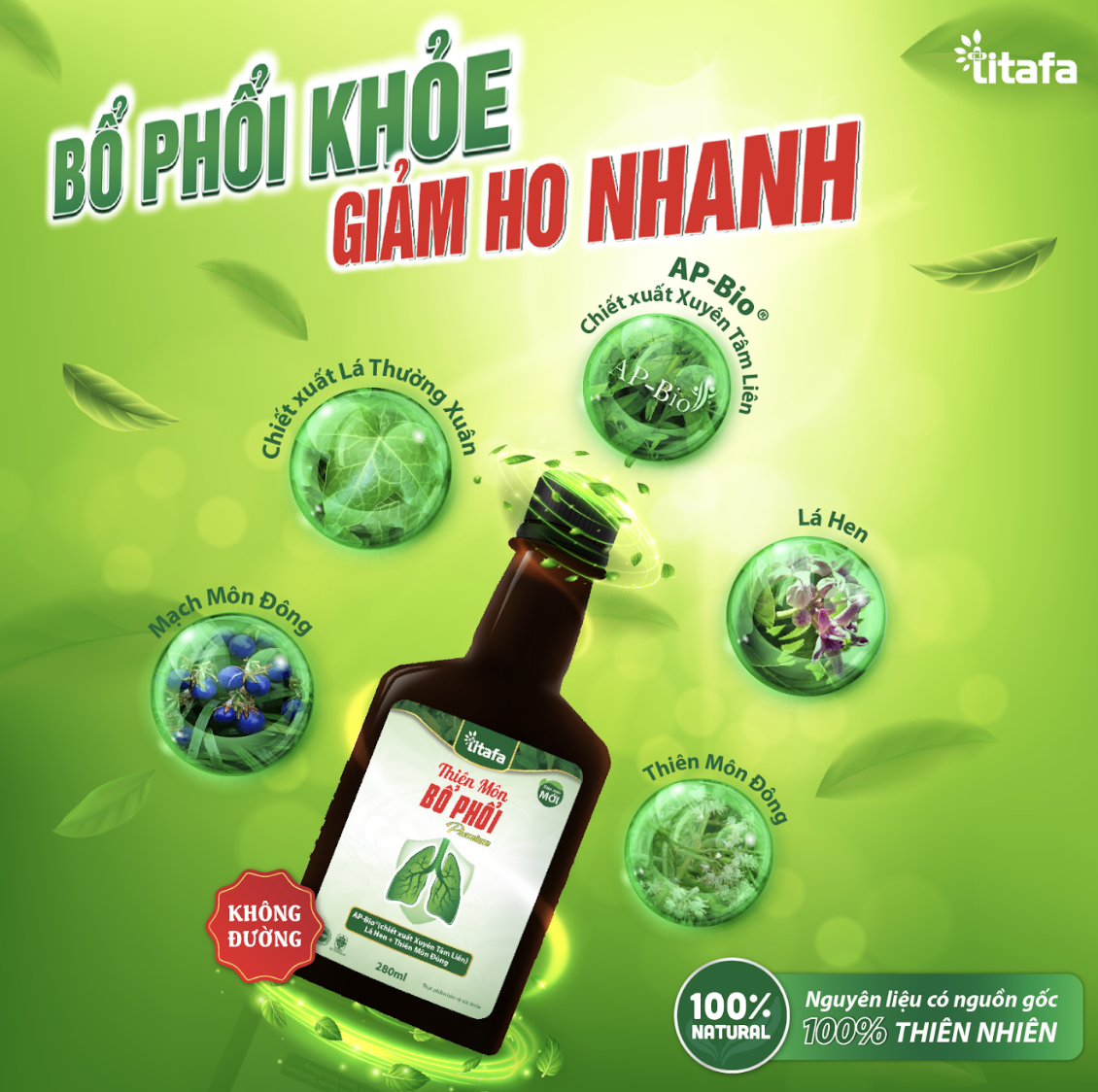 Siro Thiên Môn Bổ Phổi Premium (chai 280ml) chứa công thức hơn 10 thảo dược bao gồm AP-Bio® (chiết xuất Xuyên Tâm Liên chuẩn hóa 14:1), Chiết xuất Lá Thường Xuân 1.200mg, Thiên Môn Đông, Mạch Môn Đông, Bách Bộ, Tang Bạch Bì, Kinh Giới, Gừng, Húng Chanh… Được uống theo liệu trình hàng ngày, siro tác động toàn thân qua đường hấp thu tiêu hóa – bổ phổi từ bên trong, duy trì liên tục để phổi và đường hô hấp được nuôi dưỡng và phục hồi theo chiều sâu.