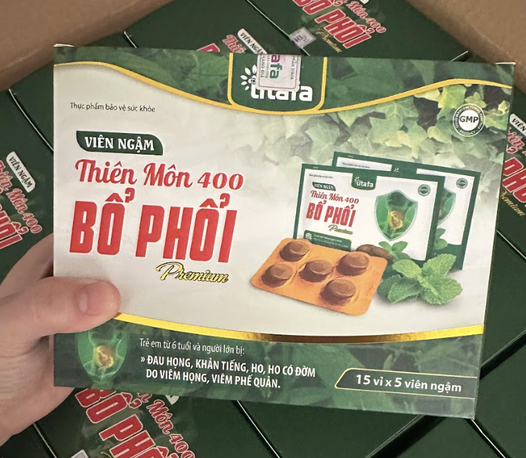Viên Ngậm Thiên Môn 400 Bổ Phổi Premium là thực phẩm bảo vệ sức khỏe do Công ty Cổ phần Titafa (TP.HCM) phân phối chính hãng, được đóng gói dạng hộp 15 vỉ × 5 viên, tiện lợi mang theo trong túi xách, hộp bút hay ngăn bàn làm việc.