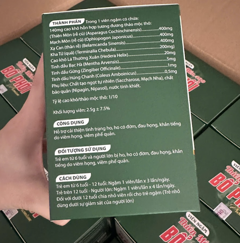 - Dùng Viên Ngậm Thiên Môn 400 Bổ Phổi Premium bao nhiêu ngày thì nên dừng? Sản phẩm có thể dùng liên tục theo nhu cầu. Tuy nhiên nếu triệu chứng ho kéo dài trên 2 tuần không cải thiện, nên đến gặp bác sĩ để được thăm khám.